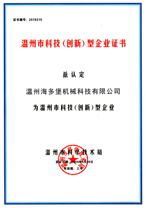 Wenzhou Haiduobao Machinery Technology Co., Ltd. was recognized as Wenzhou Science and Technology (Innovation) Enterprise in 2016, and was awarded Wenzhou Science and Technology (Innovation) Enterprise Certificate.