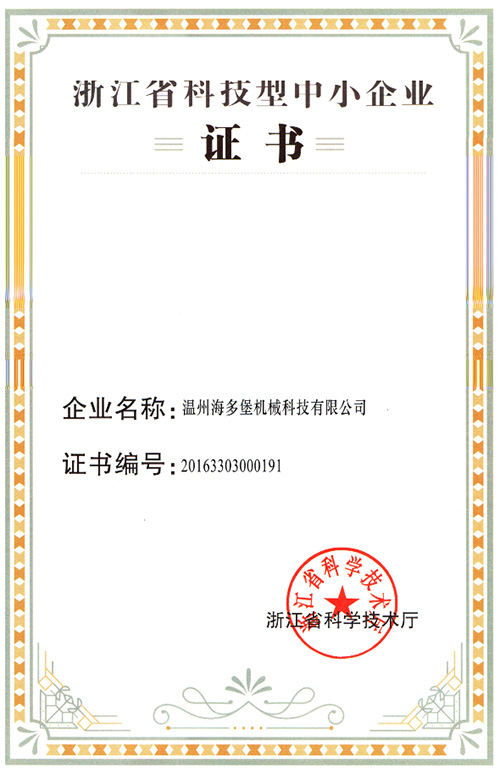Wenzhou HitoTop Machinery Technology Co., Ltd. was recognized as a scientific and technological small and medium-sized enterprise in Zhejiang Province, and was awarded the Zhejiang Provincial Science and Technology SME Certificate.